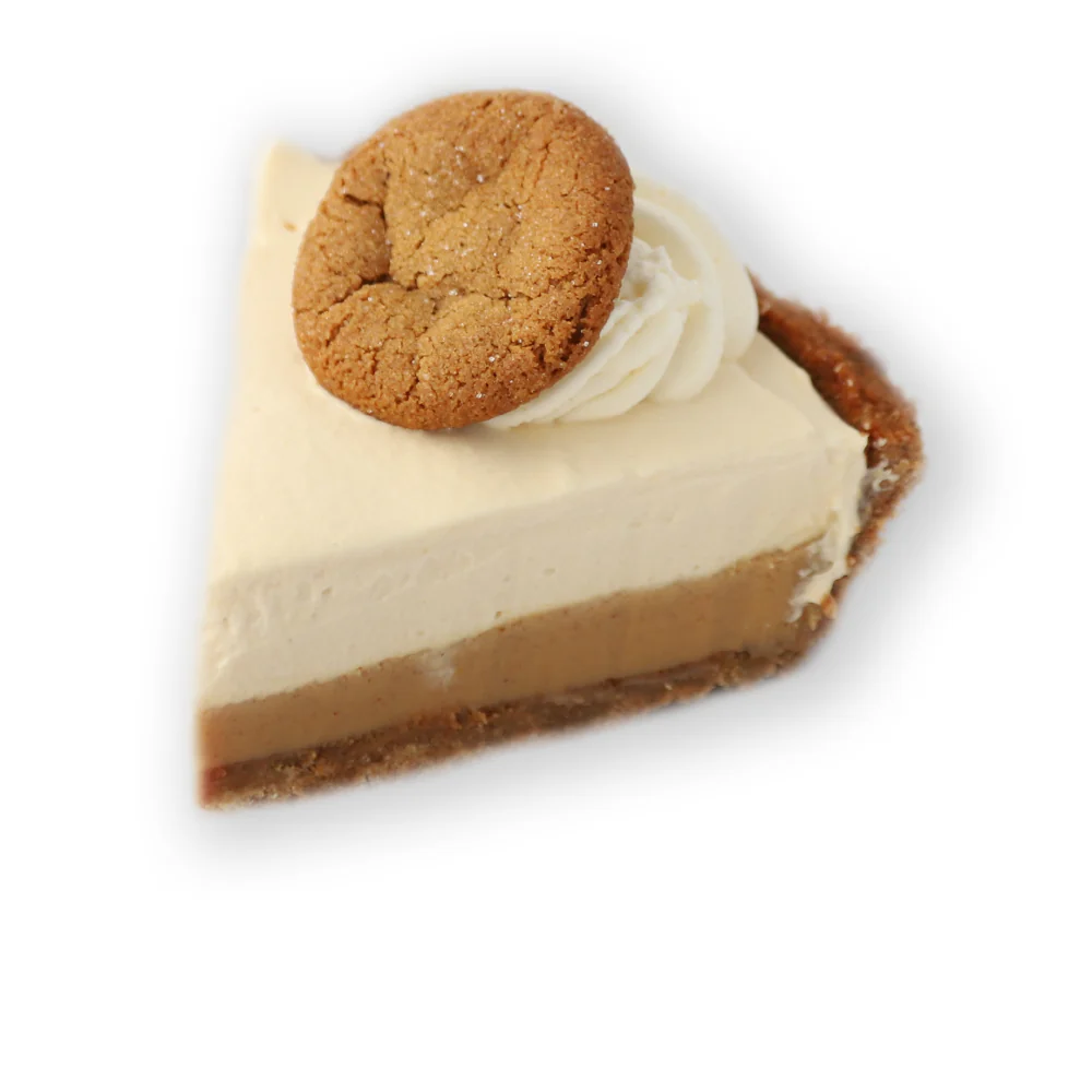 Chewy ginger molasses cookies adorn the top of this delightfully creamy gingerbread pie. A pressed graham crust holds a spiced, gingerbread custard that is topped with fresh whipped cream. Available during the holiday season only!